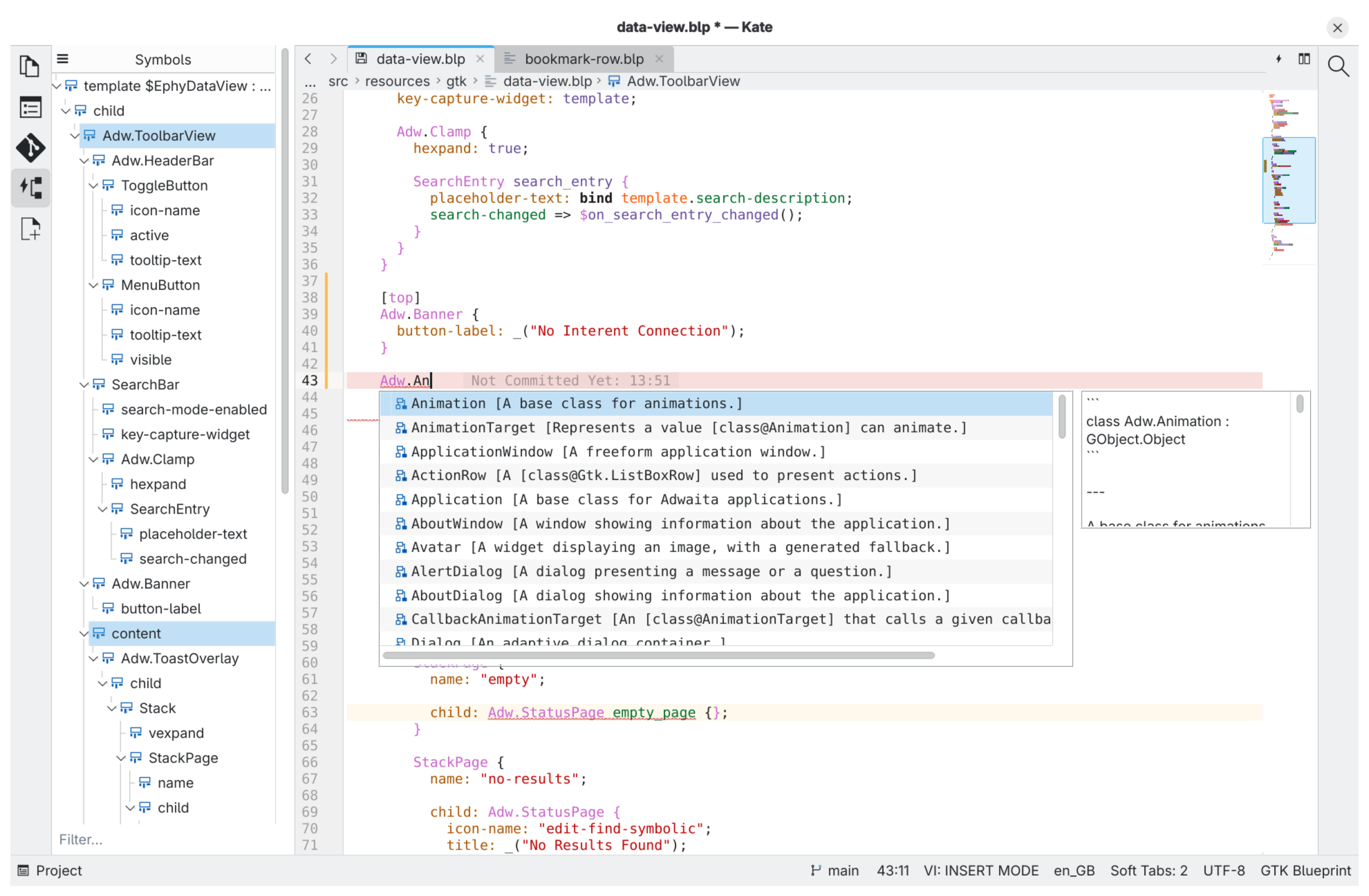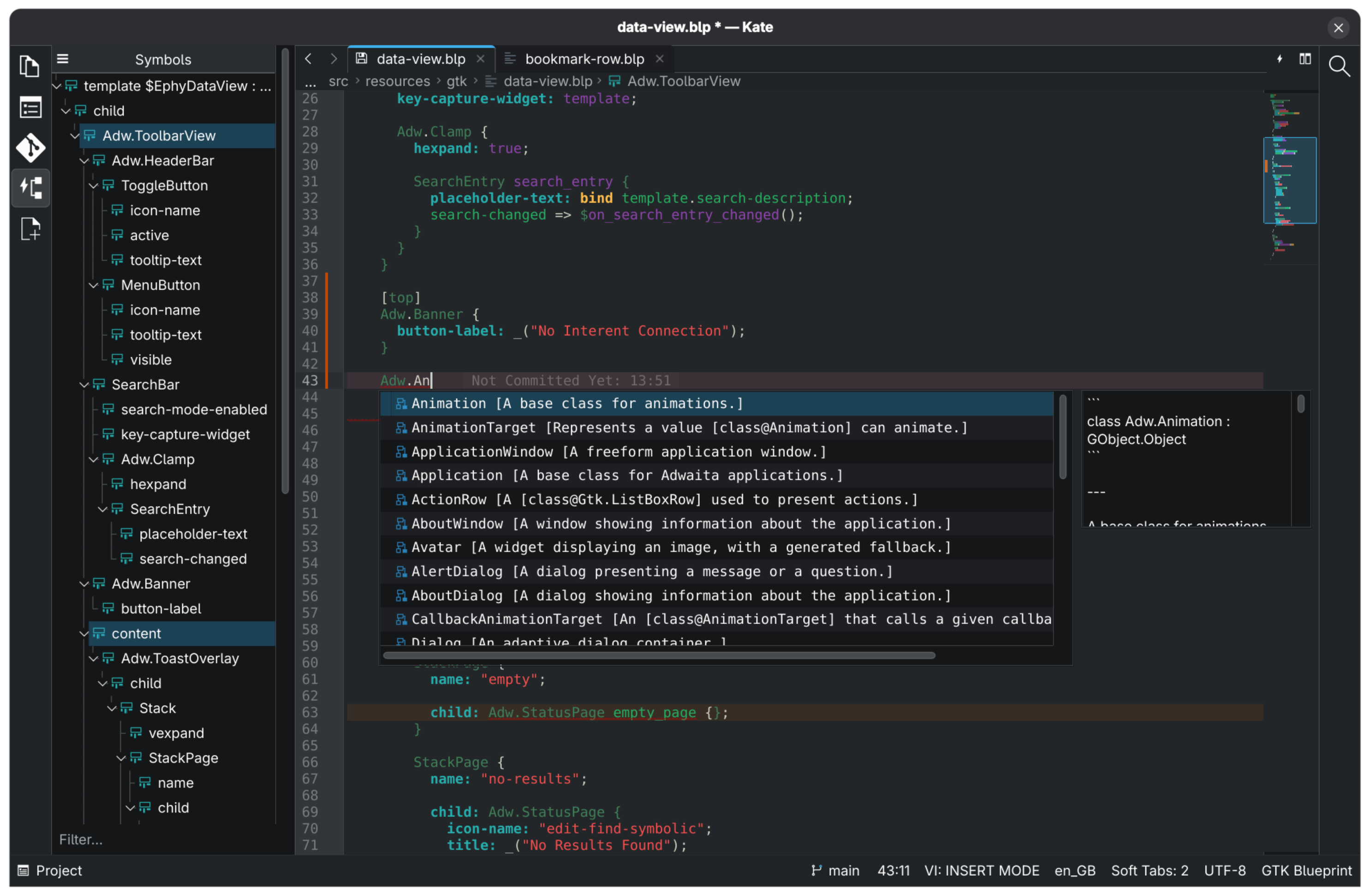 Kate is a powerful IDE developed by KDE. I helped add syntax highlighting + LSP support for GTK blueprint, a next-gen markup language for designing GNOME applications, to upstream Kate.