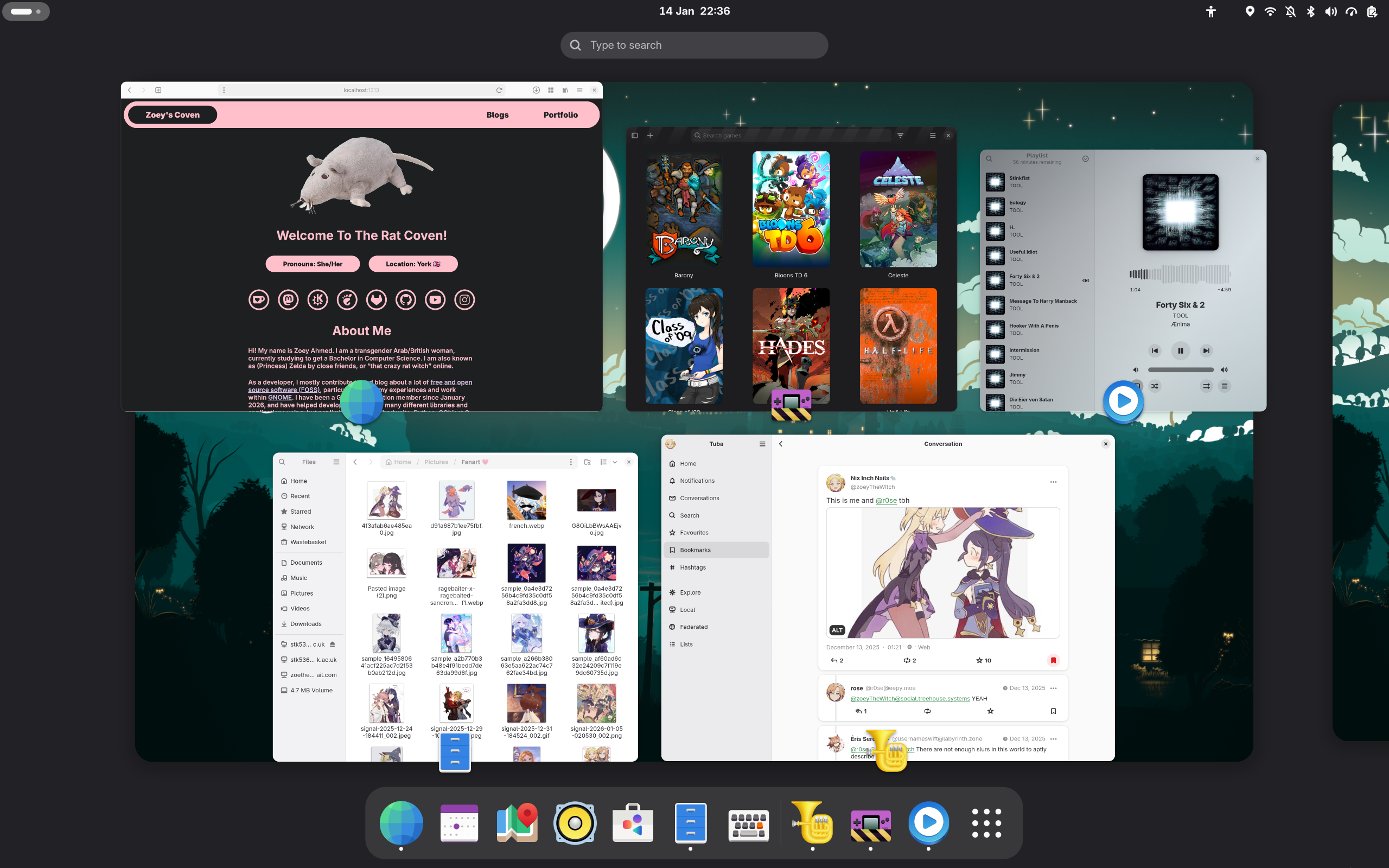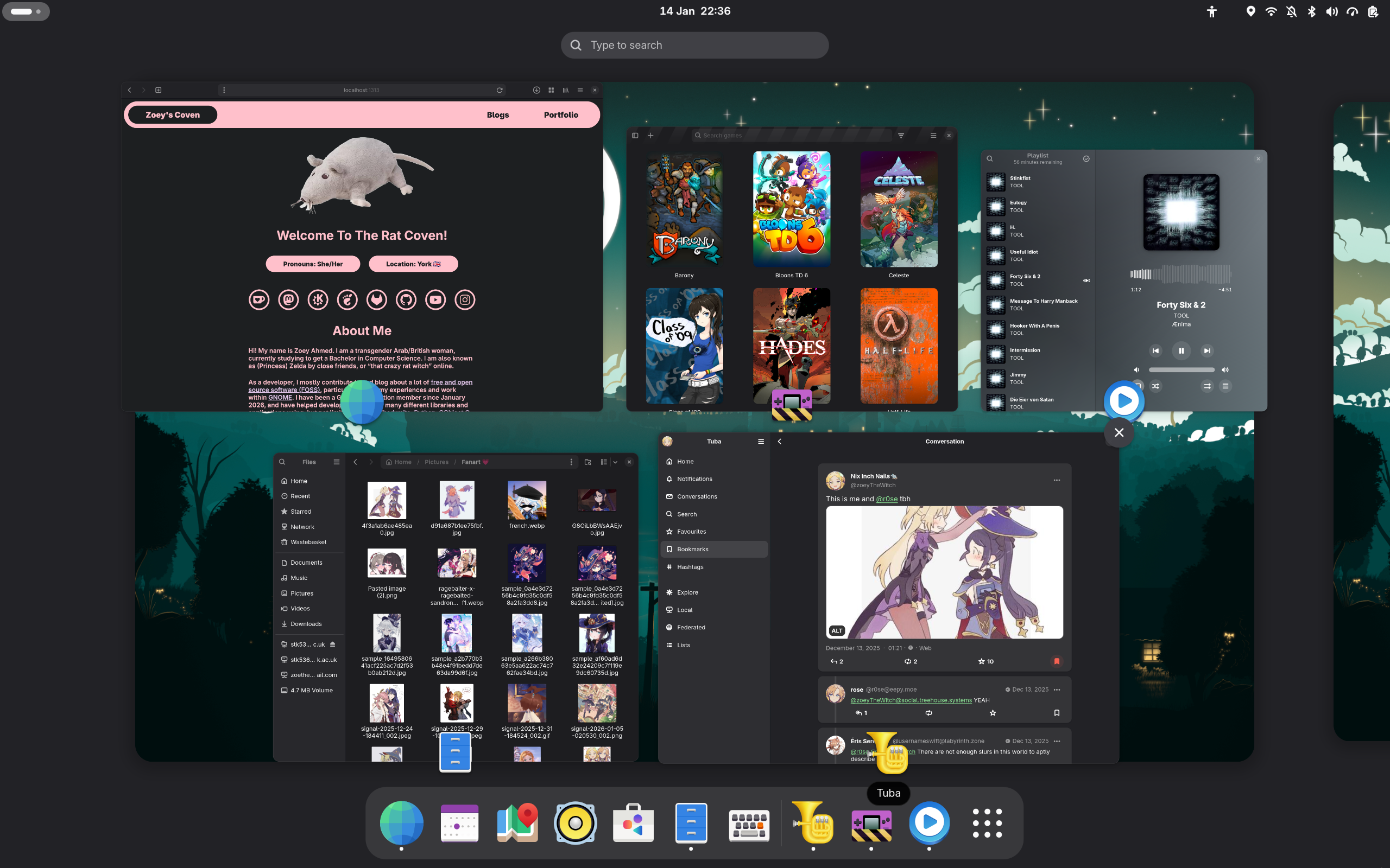 I have helped maintain many elements of, and contribute to the GNOME ecosystem, in collaboration with many other professional and volunteer designers, developers, Q/A teams and writers. I have had a hand in many Core/Circle applications, and GNOME Shell, the core UI of GNOME’s desktop on top of its window manager, and a lot more.